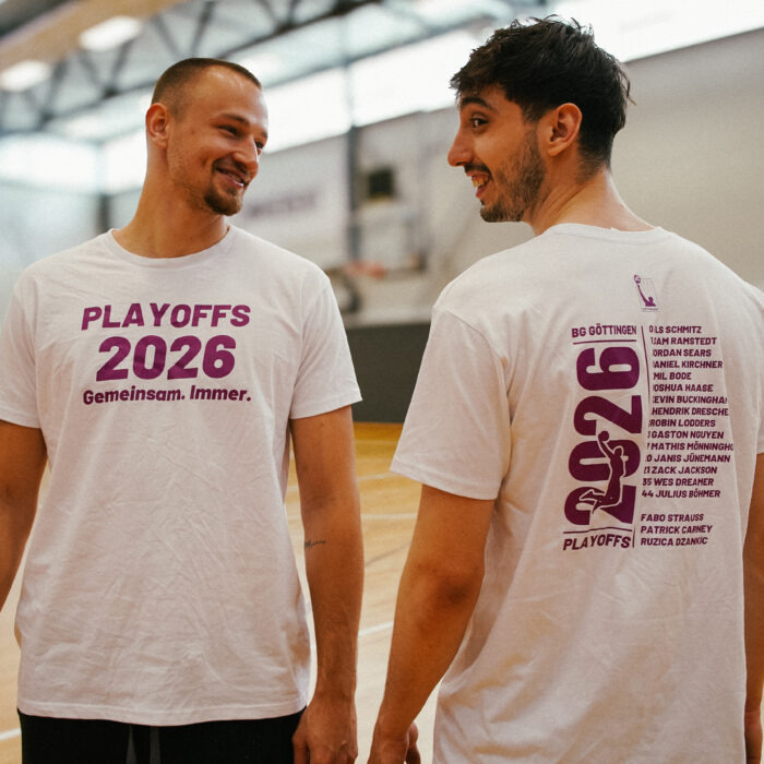 18. März 2026 – Die BG Göttingen hat am vergangenen Wochenende in der BARMER 2. Basketball Bundesliga ProA die Playoff-Teilnahme endgültig gesichert und diesen Zwischenerfolg mit den passenden T-Shirts gefeiert. Auch die Veilchen-Fans können sich eines dieser Playoff-Shirts sichern – hier im BG-Online-Shop ist eine Vorbestellung ab sofort möglich. Die Shirts werden dann voraussichtlich ab Mitte April an die Fans verschickt – die Playoffs starten am 6. Mai.